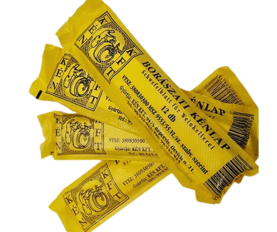 A kénlap egy szeletje 1 hl űrtartalmú hordó kénezéséhez elegendő.
